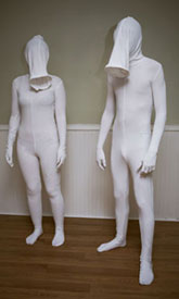 The zipper joining the two individuals at the face serves to symbolize their voluntary involvement in the relationship. Velcro, present only on one of the bodies, allows for a role division. Though both can initiate interaction, the aggressor (with velcro) can distort and change the body of the passive other, though they themselves become similarly entangled, and do not remain unaffected.